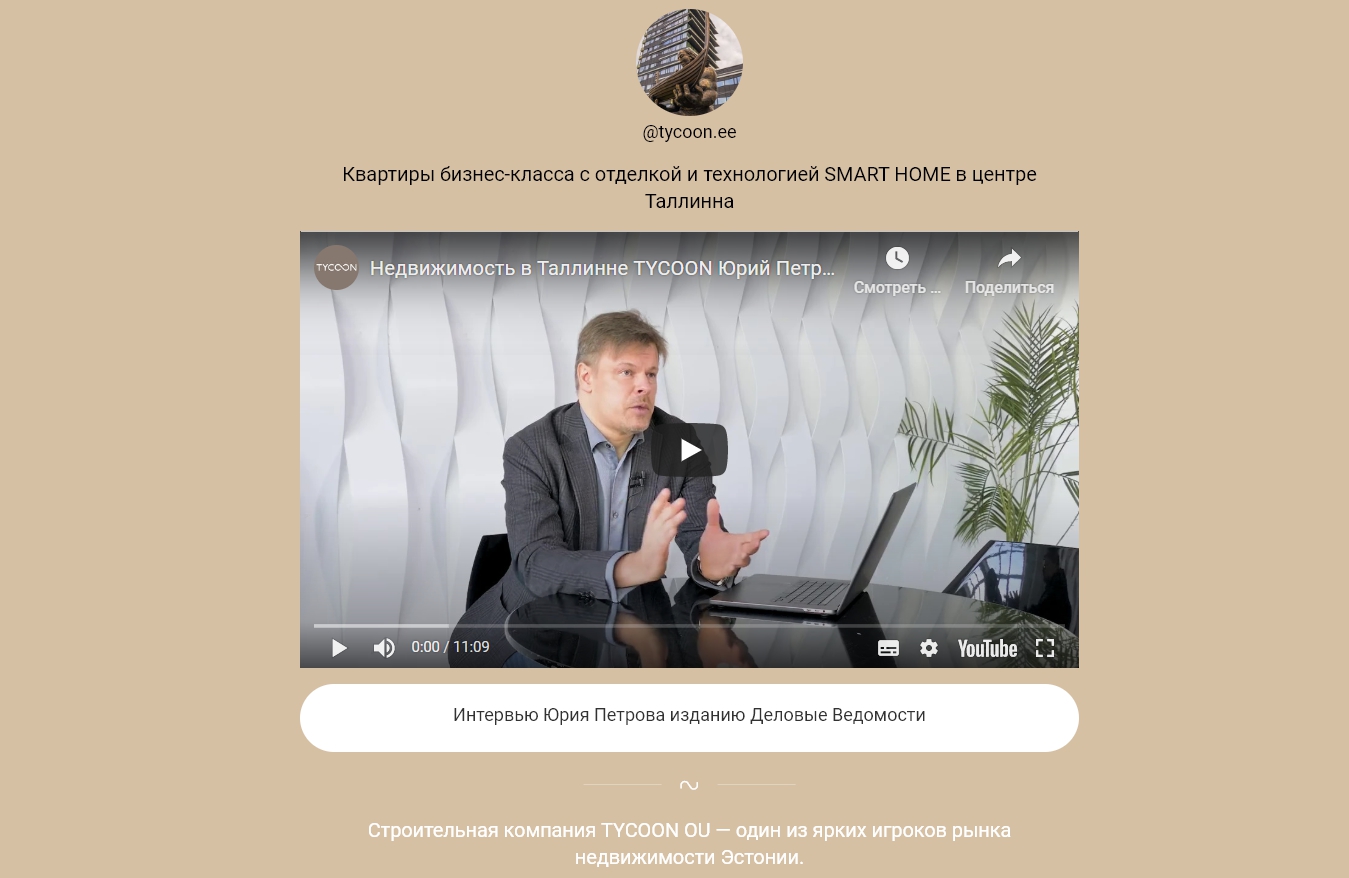 Главная задача контент-маркетинга для TYCOON — создать устойчивую ассоциацию между ЖК и его надежным застройщиком и показать, что наши квартиры — лучший выбор в домах бизнес-сегмента в Таллине. Кроме того, сформировать образ компании с узнаваемым человеческим лицом через личный бренд управляющего партнера, чтобы клиенты доверяли лично мне и понимали, у кого именно они будут покупать недвижимость.