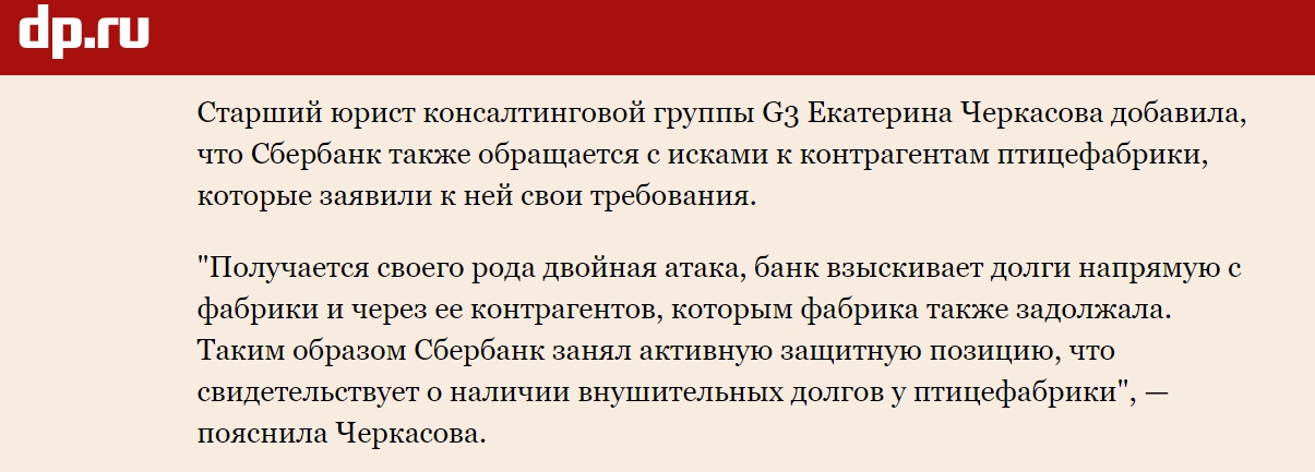 Например, когда «Сбербанк» подал иск о банкротстве «Синявинской птицефабрики», юрист G3 высказал свое мнение по поводу этой ситуации.