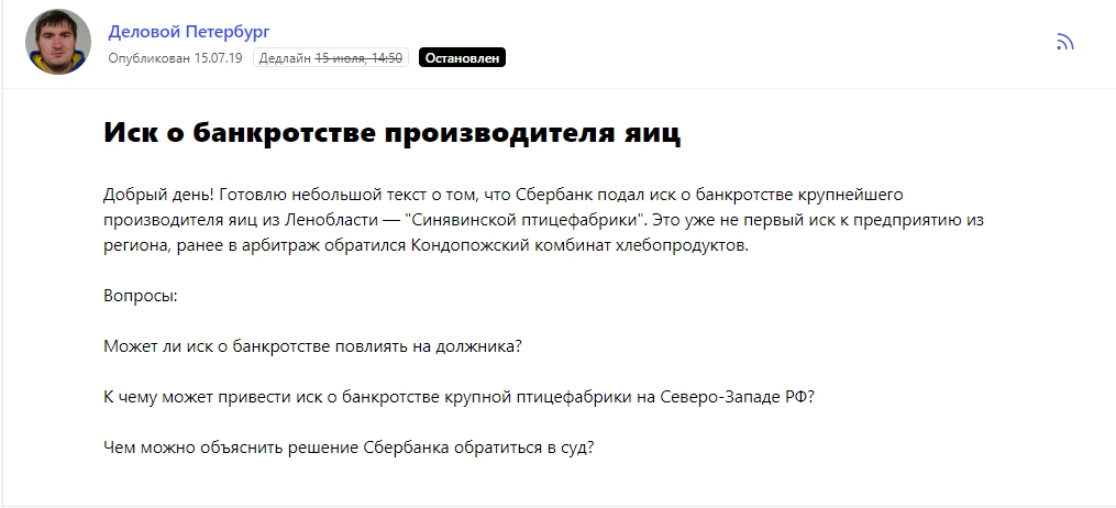 Обычно через Pressfeed наши юристы дают комментарии, касающиеся горячих новостей. Много раз так работали с изданием «Деловой Петербург», корреспонденты этой площадки часто размещают запросы на сервисе.