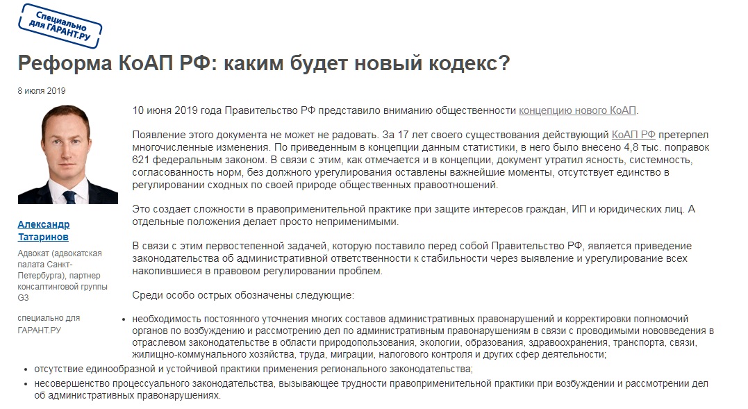 Пример статьи для «Гарант.ру» — юрист G3 рассуждал о реформе Кодекса об административных правонарушениях.