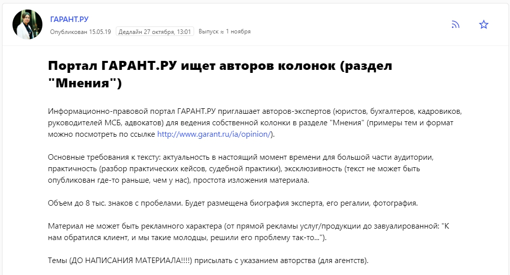 Редакция таким образом расширяет пул экспертов и авторов, а юрист, который только начинает свой пиар в СМИ, сможет попробовать написать свою первую колонку.