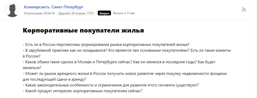 Также удавалось сотрудничать с региональным «Коммерсантом». Редакция искала экспертов, которые ответят на вопросы о покупке жилья для корпоративных нужд.