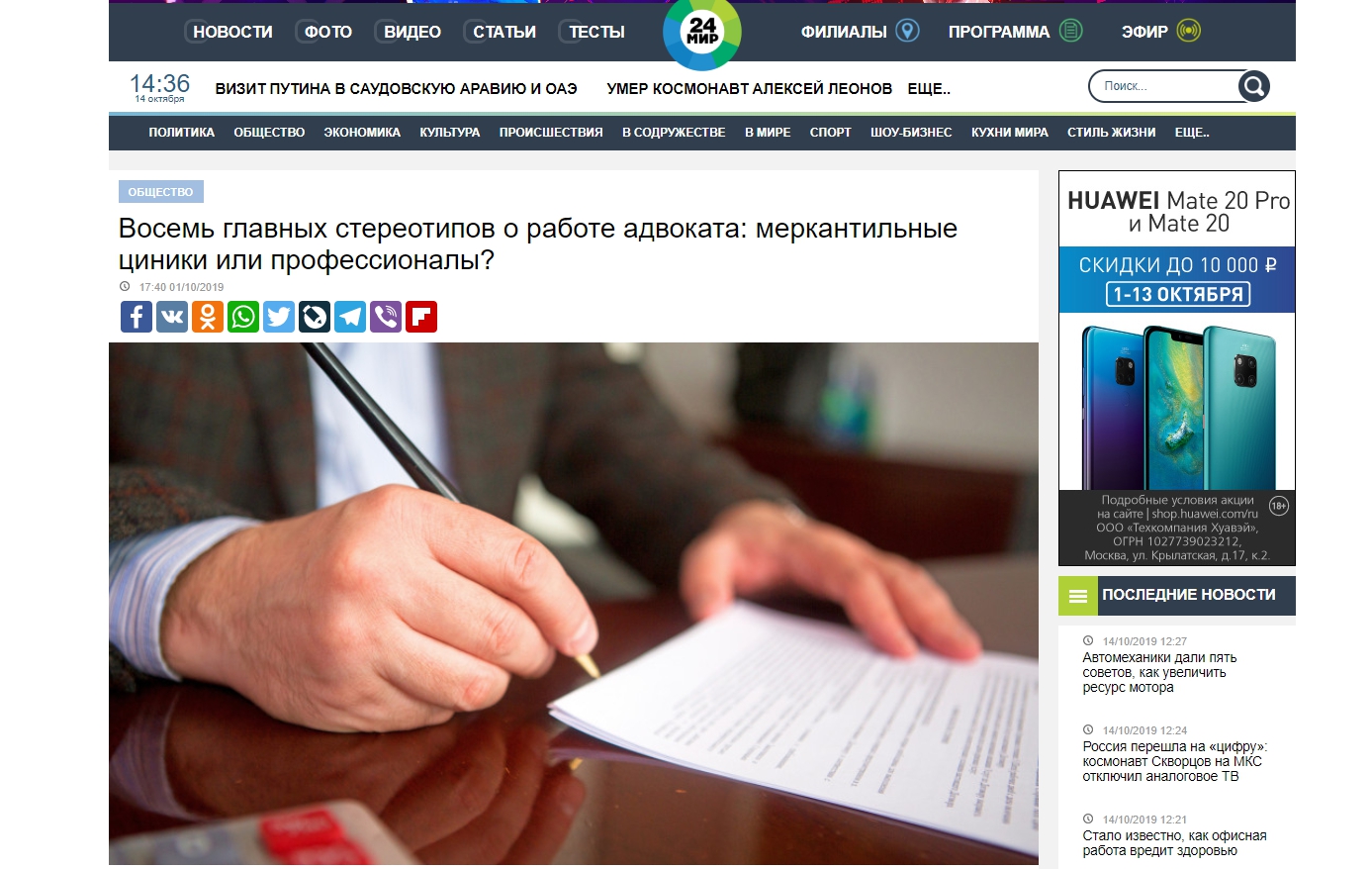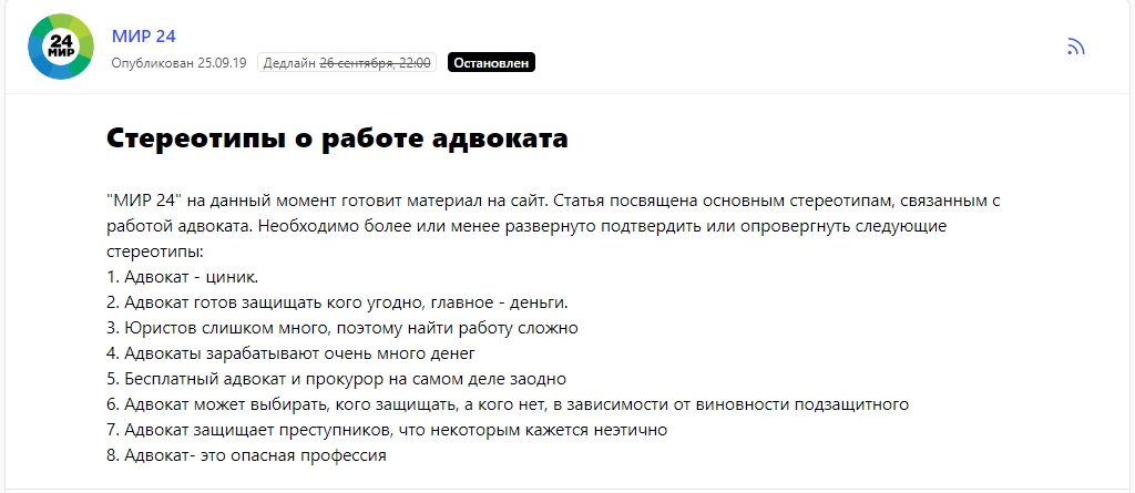 Также через Pressfeed можно знакомиться с редакциями новых изданий, а затем контактировать с ними уже напрямую. В прошлом месяце впервые вышли на телеканал «МИР 24». Площадка хотела развенчать стереотипы об адвокатах.
