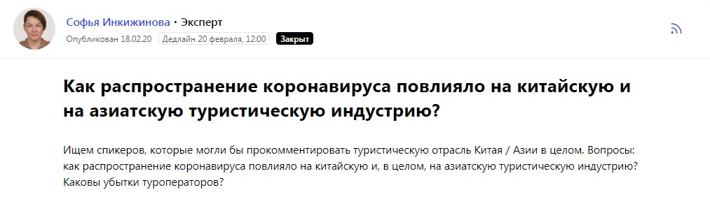 Найти экспертов, которые скажут, что будет с туризмом по России, было бы несложно: конференции с участниками рынка, ключевыми фигурами проходили чуть ли не ежедневно в любом доступном формате. Безусловно и это тоже важно, но у нас стояла другая задача. Нам было важно взять именно международный рынок, а так как я не часто или вообще никогда не писала на эту тему, то мне было сложно найти таких спикеров и, соответственно, я обратилась к Pressfeed и с помощью сервиса нашла троих спикеров. Это дало мне большую фору по времени к подготовке материала.