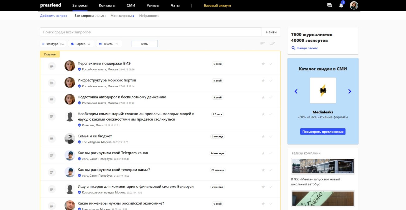 Думаю, мало кому из пиарщиков уже нужно объяснять, в чем суть Pressfeed. Именно из-за его удобства сервисом пользуются не только профессионалы, но и эксперты, руководители небольших компаний. Мы используем платный пакет, который дает возможность оперативнее отвечать на неограниченное количество запросов и видеть, сколько комментариев уже дано. Так у нас больше шансов попасть в материал. Но, пожалуй, главный плюс Pressfeed ― это удобный агрегатор, который дает актуальный срез того, что интересует редакции в режиме реального времени.