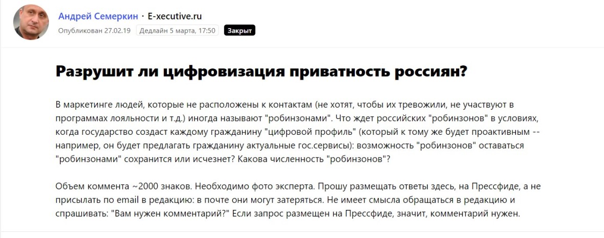 В другой раз давали комментарий для бизнес-площадки E-xecutive о «робинзонах» современного мира.