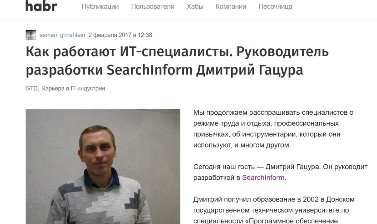 У нас регулярны такие истории с публикациями на Habr. Пример ― публикация о начальнике отдела разработки «СёрчИнформ» Дмитрие Гацуре в тематическом Хабе «Как работают ИТ-специалисты».