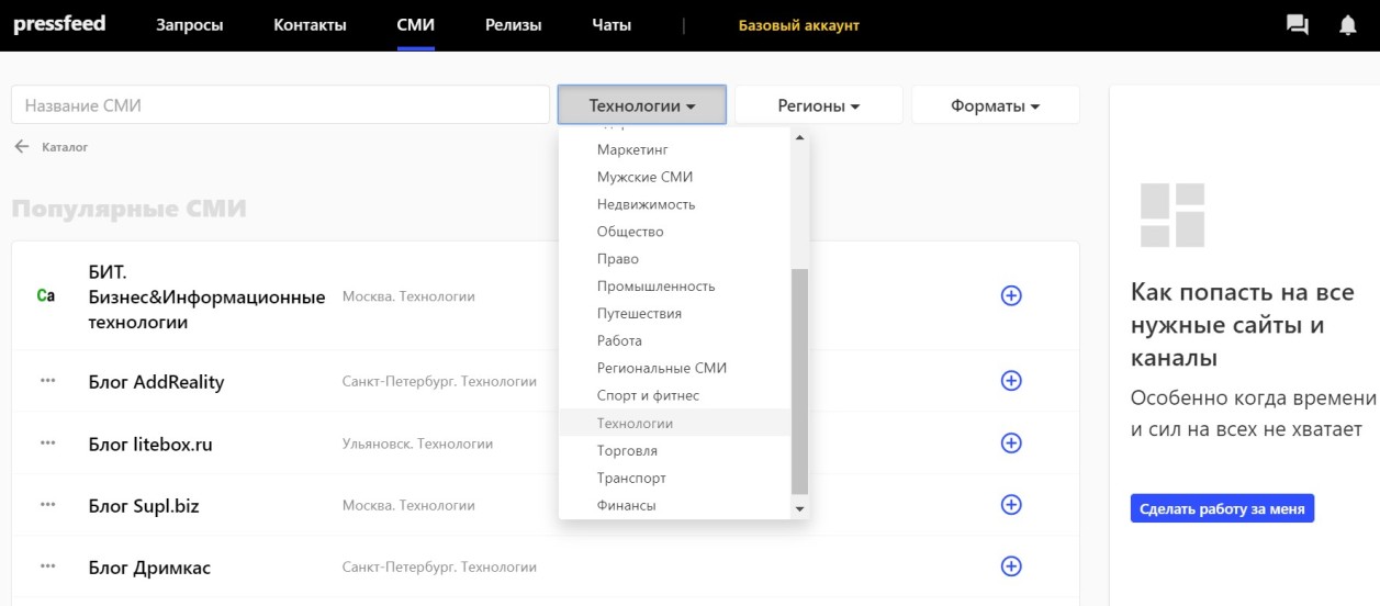 Если вас интересуют отраслевые издания, пишущие на тему технологий, заходите в раздел «СМИ» и выбирайте фильтр «Технологии». Ищите то, что понравится, и связывайтесь с журналистами редакции прямо через сервис с помощью внутренних чатов. Предложите темы для публикаций, спикеров компании, расскажите, чем можете быть полезны для издания.