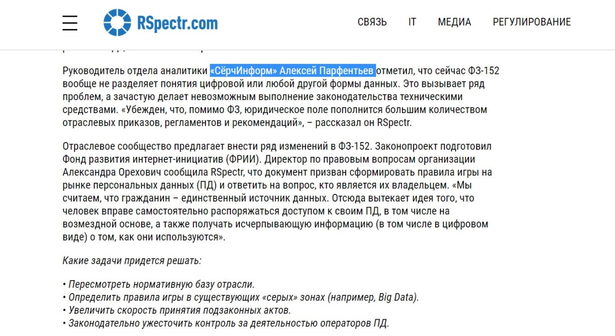 Публикация о сотруднике «СёрчИнформ»