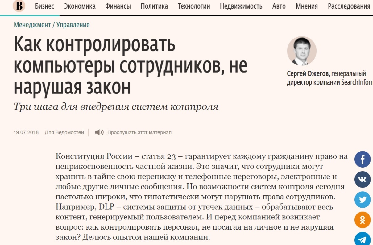 Мы не можем говорить про большую часть наших клиентов, нас редко открыто рекомендуют, и совсем редко кто-то из заказчиков готов на публику рассказывать об опыте использования нашего ПО. Раз мы не имеем возможности рассказывать об экспертизе компании через отзывы клиентов, PR-служба «СёрчИнформ» регулярно инициирует экспертные колонки, комментарии в целевых СМИ.