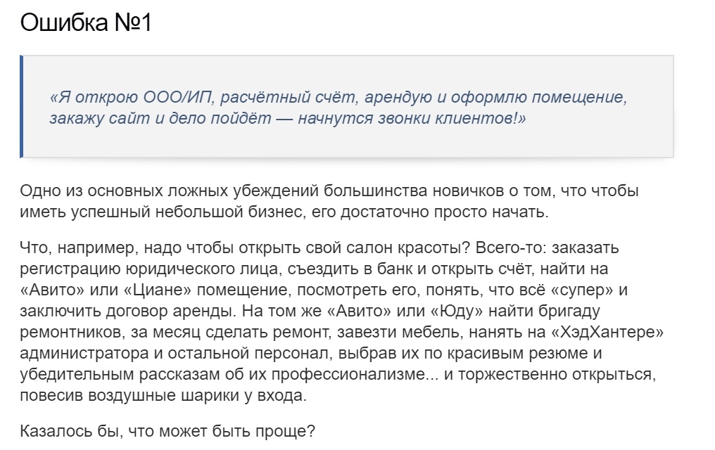 В другой раз с помощью сервиса мы сделали объемную статью об ошибках при открытии бизнеса. Она вышла на площадке hiterbober.ru — это бизнес-журнал для начинающих предпринимателей, на 100% наша целевая аудитория.