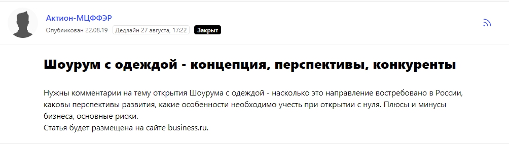 На данный момент на сервисе Pressfeed больше всего подходящих для нас запросов (в среднем на сервисе размещается около 500 запросов ежедневно). Подобные платформы удобны тем, что компании не нужно рассылать письма по редакциям, предлагать темы и экспертов, долго ждать ответа или вообще не получить его. Здесь все прозрачно и понятно: журналист выложил запрос с темой и вопросами, обозначил требования и сроки. Тот, кто пришлет лучший ответ, — развернутый и по делу — и попадет в итоговую публикацию.