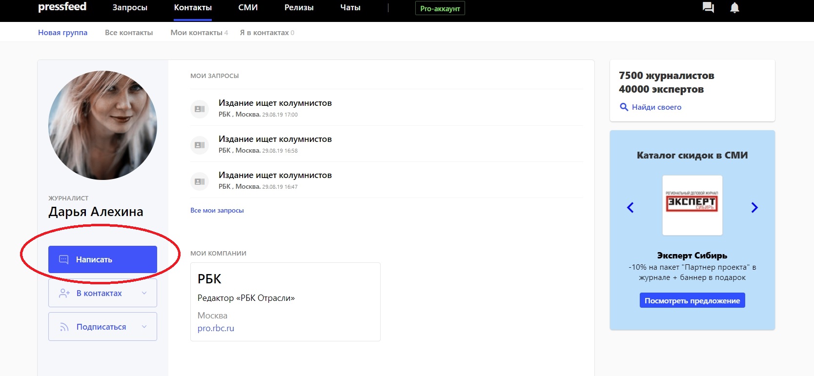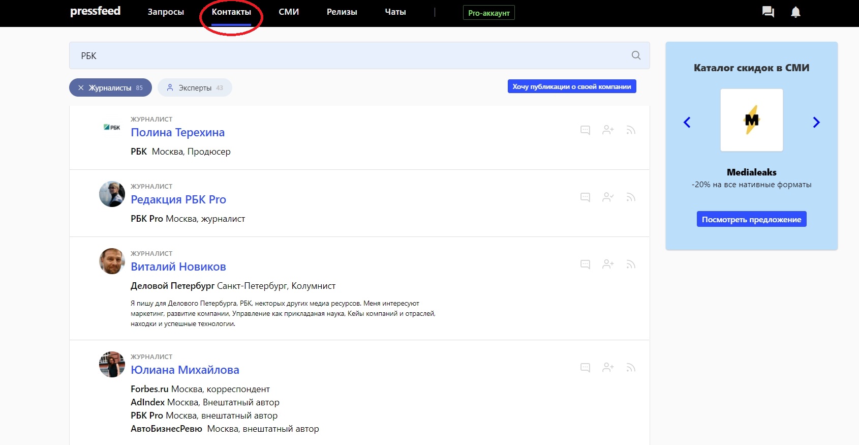 Заходите в «Контакты» — вводите название издания, куда хотите попасть (например, «РБК») — выбираете нескольких журналистов (можно найти таких, кто пишет сразу для 2-3 СМИ) — пишете каждому во внутреннем чате.