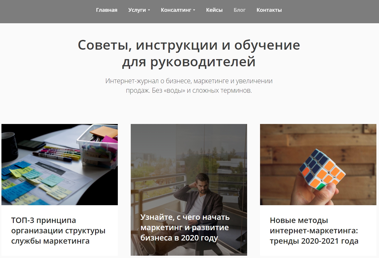 На сайте компании есть отдельная вкладка «Блог». Там мы пишем обо всем, что связано с интернет-маркетингом. Блог компании — это важнейший компонент контент-маркетинга, и мы хотели бы, чтобы в будущем блог превратился в полноценное медиа о маркетинге.
