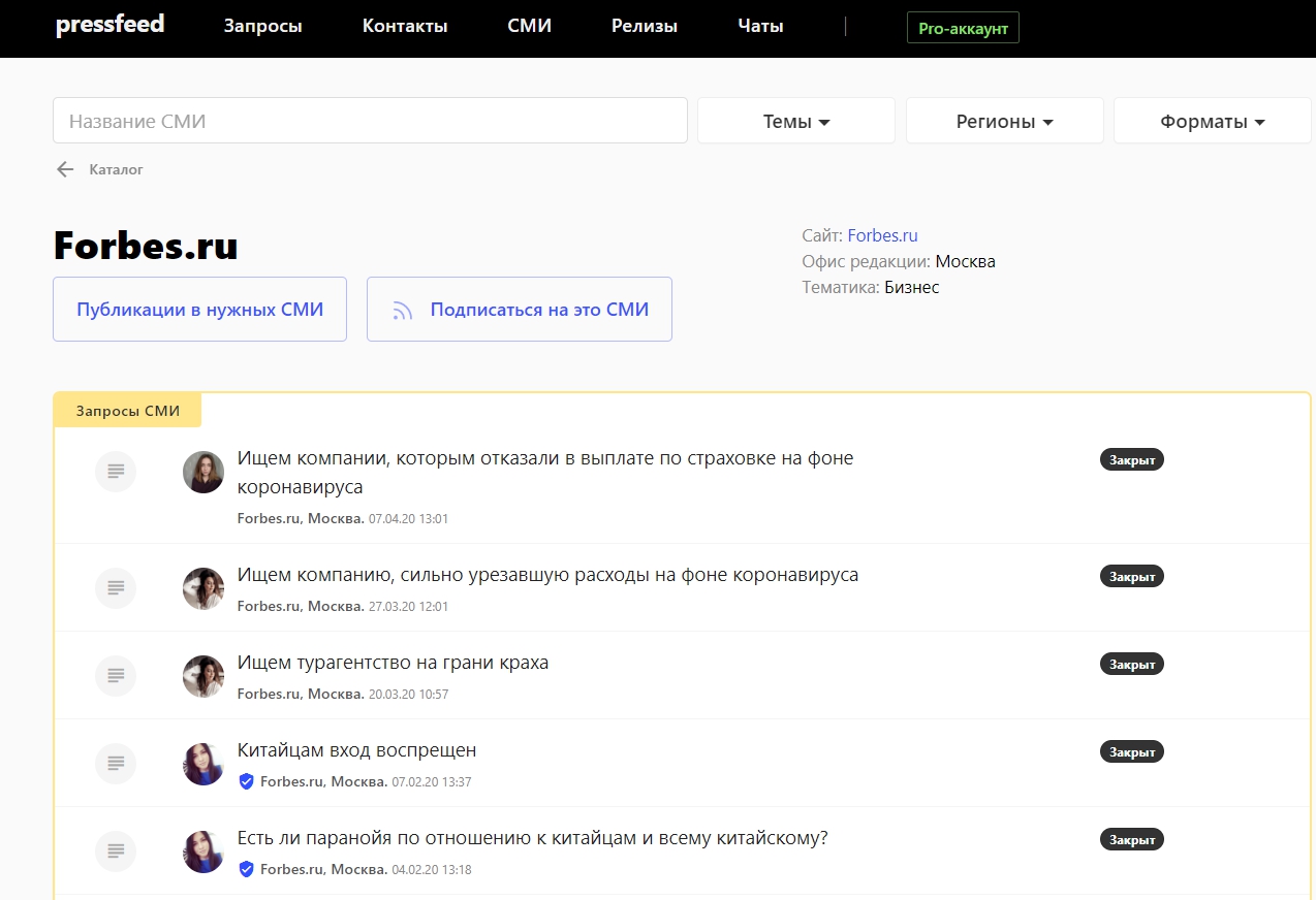 Главное преимущество сервиса, на мой взгляд, что там можно работать с уже сформированным спросом. Можно провести аналогию с теплотой клиентов. На Pressfeed находятся «горячие» журналисты, которых не придется ни в чем убеждать: им прямо сейчас нужны комментарии или полноценные тексты от экспертов. Если вы предложите им то, что соответствует запросу, то точно получится сделать совместный материал. Тем более, на сервисе можно работать бесплатно (но только на базовом тарифе с некоторыми ограничениями).