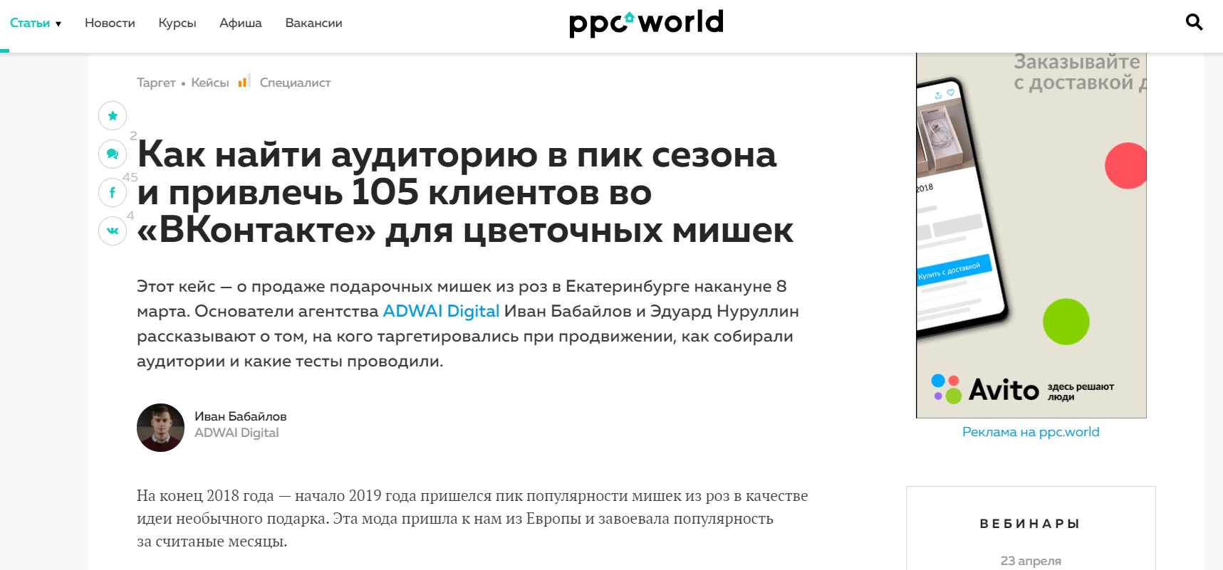 В другой раз мы написали статью для ppc.world — раскрыли подробности кейса по продвижению цветочных мишек через «ВКонтакте».