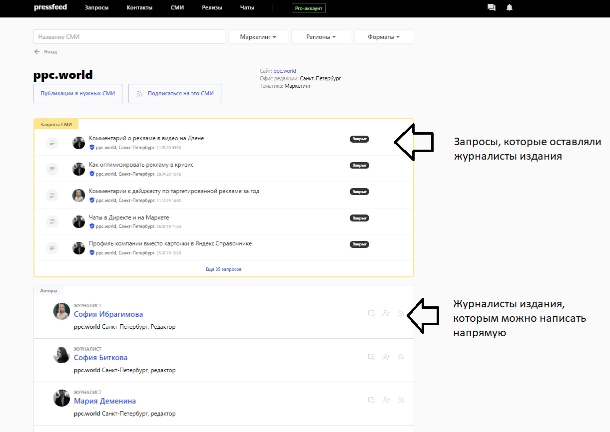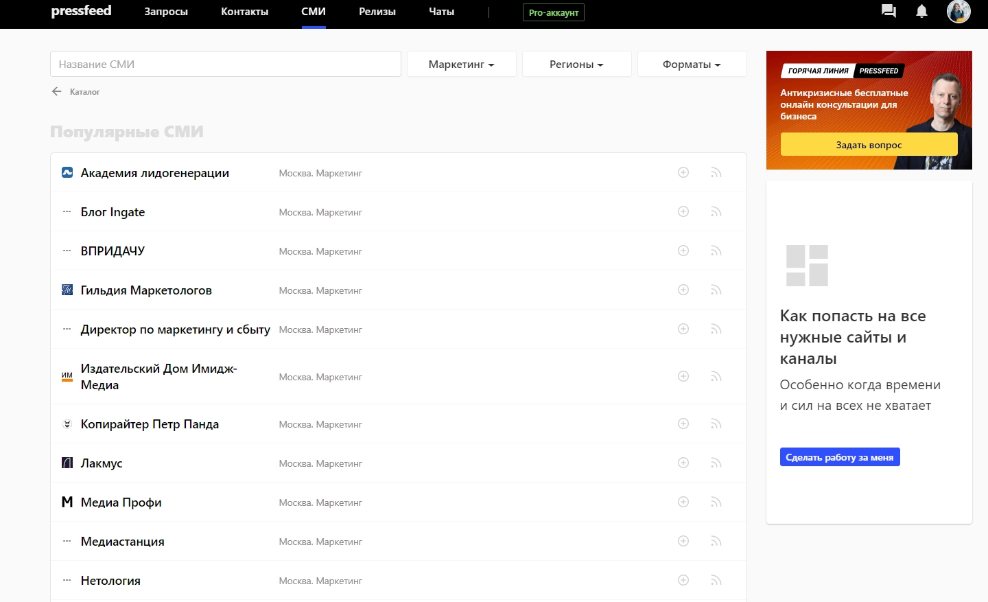 Вообще на любое маркетинговое издание можно выйти через Pressfeed. Для этого нужно зайти в раздел «СМИ» и выбрать категорию «Маркетинг». Затем можно посмотреть список площадок, изучить, какие запросы их журналисты оставляли на сервисе.