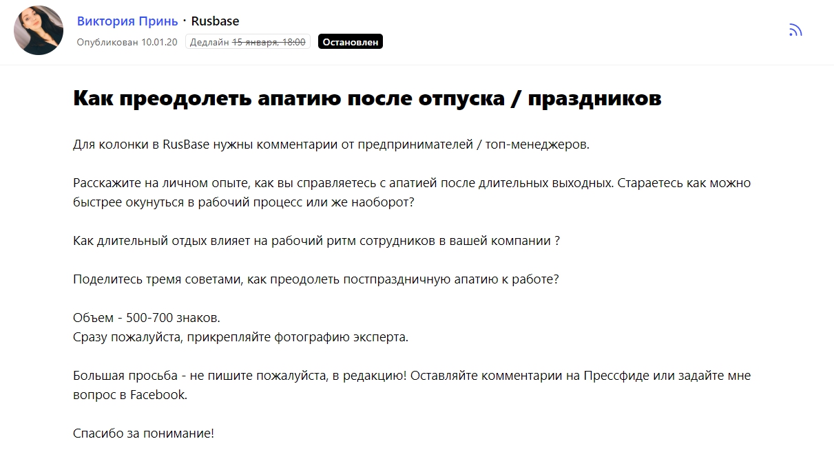 А вот в январе 2020 года мы ответили на запрос от редакции Rusbase на Pressfeed. Журналист спрашивал, как преодолеть апатию после отпуска.