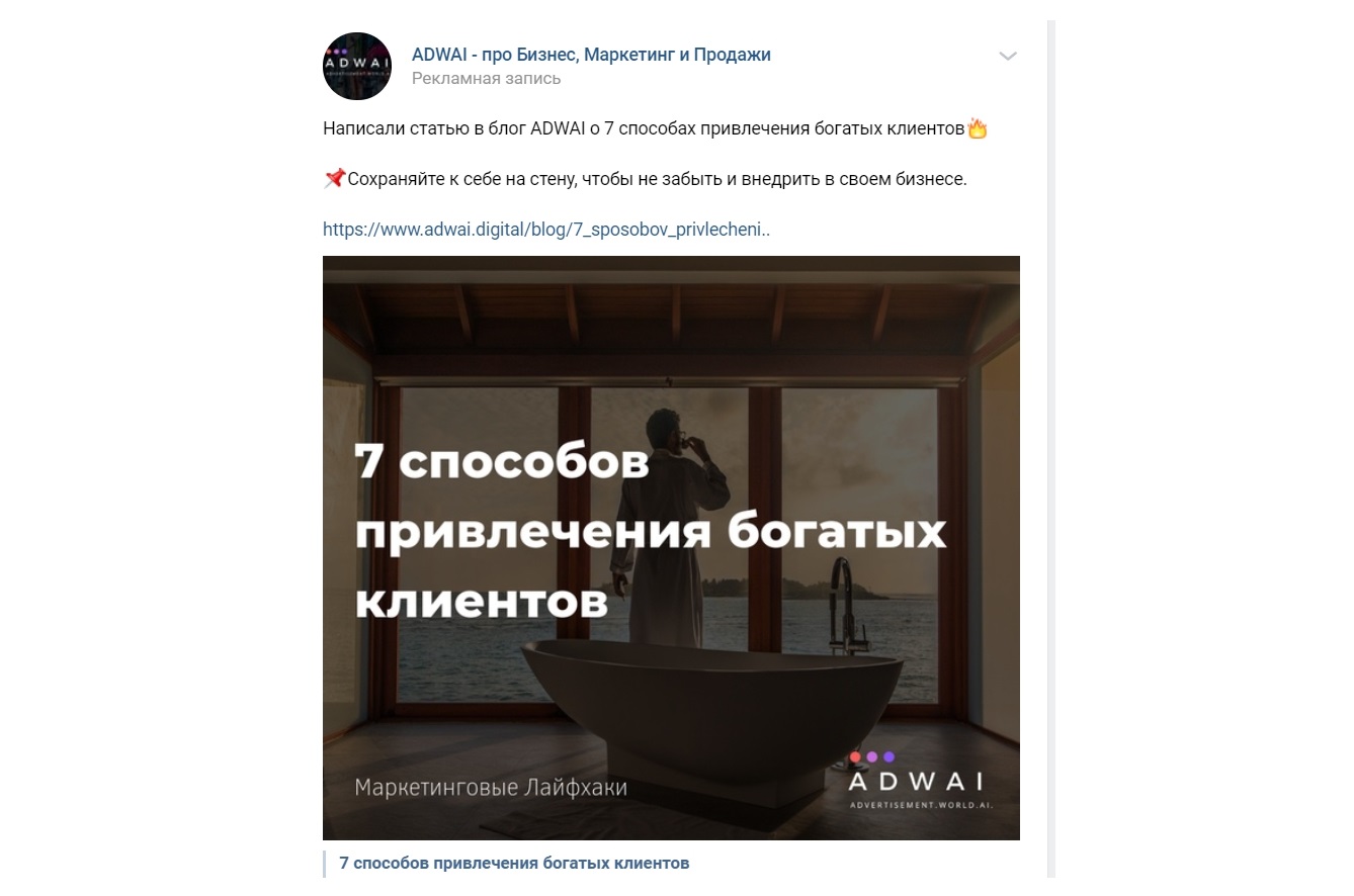 Лучшие статьи продвигаем с помощью таргетированной рекламы в соцсетях — так они точно дойдут до тех, кто должен их увидеть (директора по маркетингу, собственники бизнеса и другие представители ЦА).