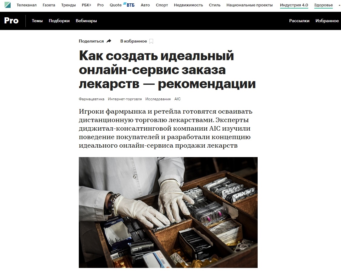 Итак, мы стали работать с деловыми СМИ и транслировать через них новые месседжи. Один из ярких примеров — статья для «РБК Pro», в которой мы разобрали, как создать идеальный сервис для доставки лекарств. Это первый заход на фармрынок, и мы решили использовать актуальный сейчас повод — закон, разрешающий дистанционную торговлю лекарствами. Команда AIC потратила месяц на проведение исследования и разработку концепции онлайн-сервиса.