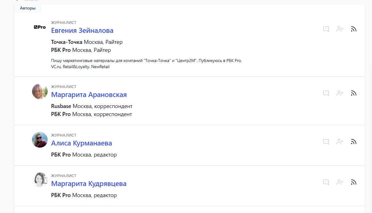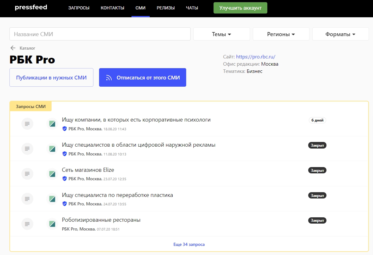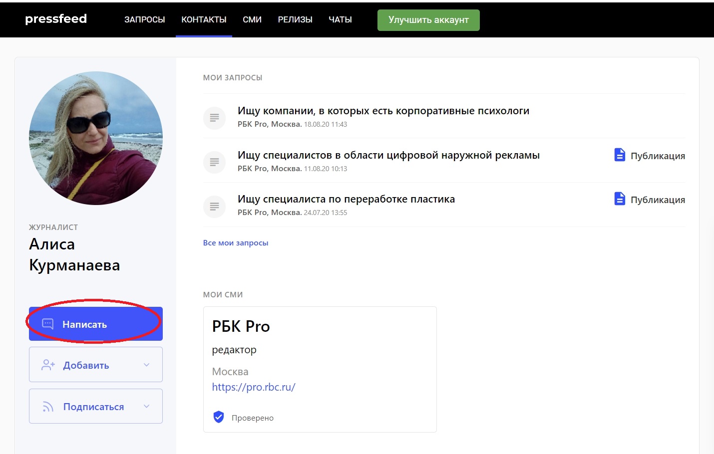 Журналисту можно написать во внутренних чатах Pressfeed. Для этого нужно зайти на страницу конкретного издания на сервисе, например, РБК Pro: