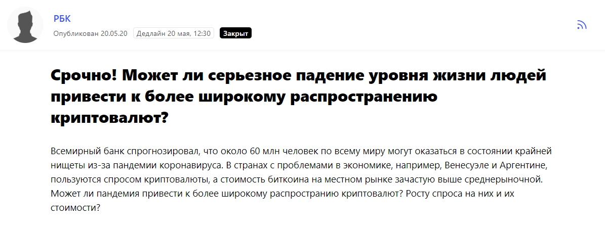 Кроме того, мы начали часто давать комментарии для крупных бизнес-СМИ через сервис журналистских запросов Pressfeed. Это платформа, на которой представители редакции выкладывают запросы на поиск экспертов, которые могут высказать свое мнение на ту или иную тему. Каждый день на сервисе размещено примерно 300-350 «объявлений» от разных журналистов. Наша задача — выбрать релевантную тему в релевантном СМИ и ответить до окончания дедлайна. Если журналист посчитал ответ ценным, то он поставит комментарий в свою статью.