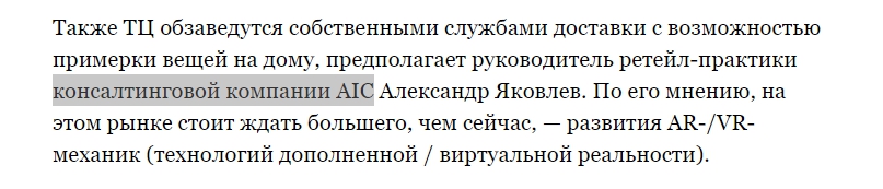 Конечно, полноценные статьи от лица экспертов AIC более явно демонстрируют позицию компании, но комментарии тоже играют свою роль — даже небольшое упоминание, особенно в крупных популярных медиа, делает вклад в узнаваемость и имидж бренда. Так что обязательно общаться с журналистами напрямую, а параллельно смотреть, что интересного появляется на Pressfeed.