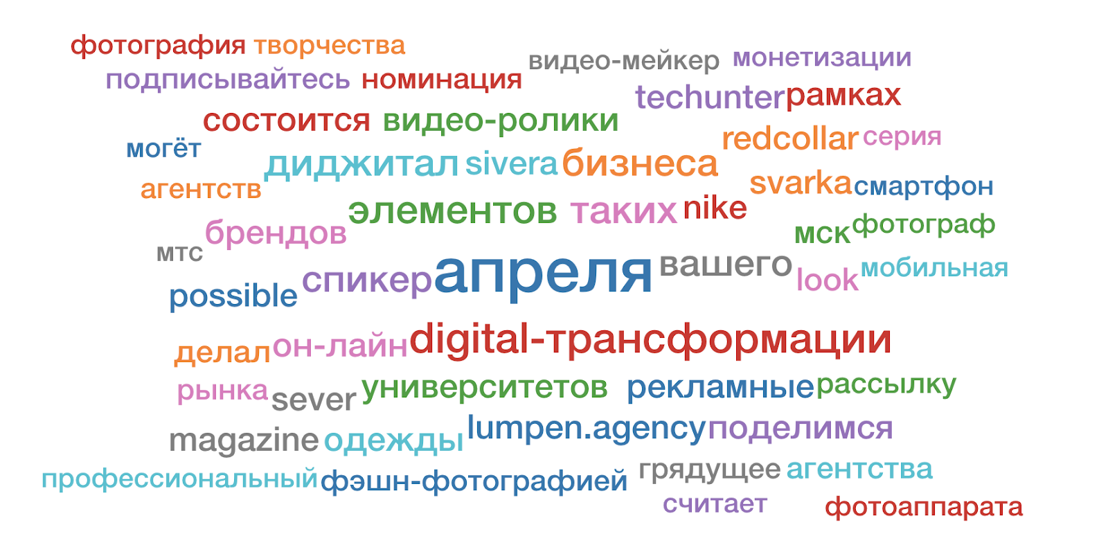 Сейчас основная задача — наработать стабильное количество упоминаний бренда в контексте digital-трансформации и консалтинга. Кстати, это нам уже начинает удаваться, это видно по облаку слов из системы мониторинга.