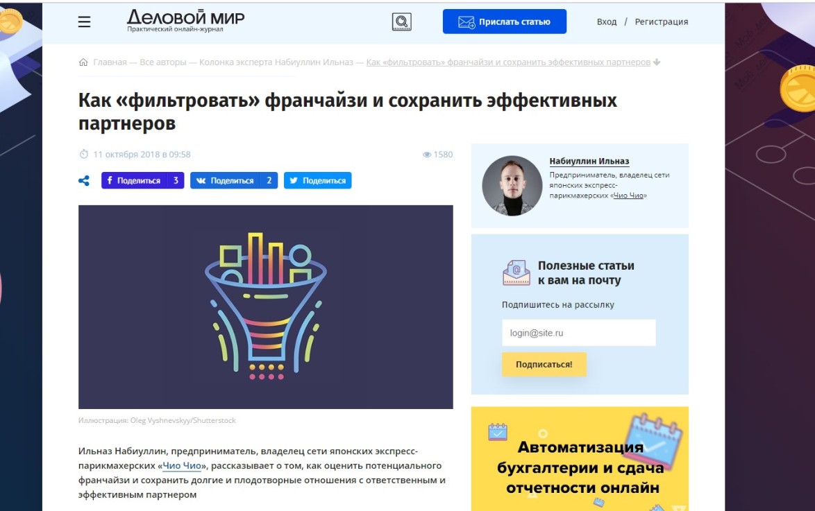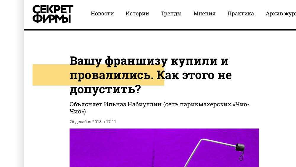 Мы, контент-бюро «Хорошая история», пишем простые тексты для сложных бизнесов. В начале 2018 года к нам обратился Ильназ Набиуллин, опытный франчайзер, его основной проект на данный момент — сеть японских экспресс-парикмахерских «Чио Чио». Клиент поставил перед нами задачу — трансформировать его репутацию с помощью контент-маркетинга, то есть публикаций в крупных российских СМИ.