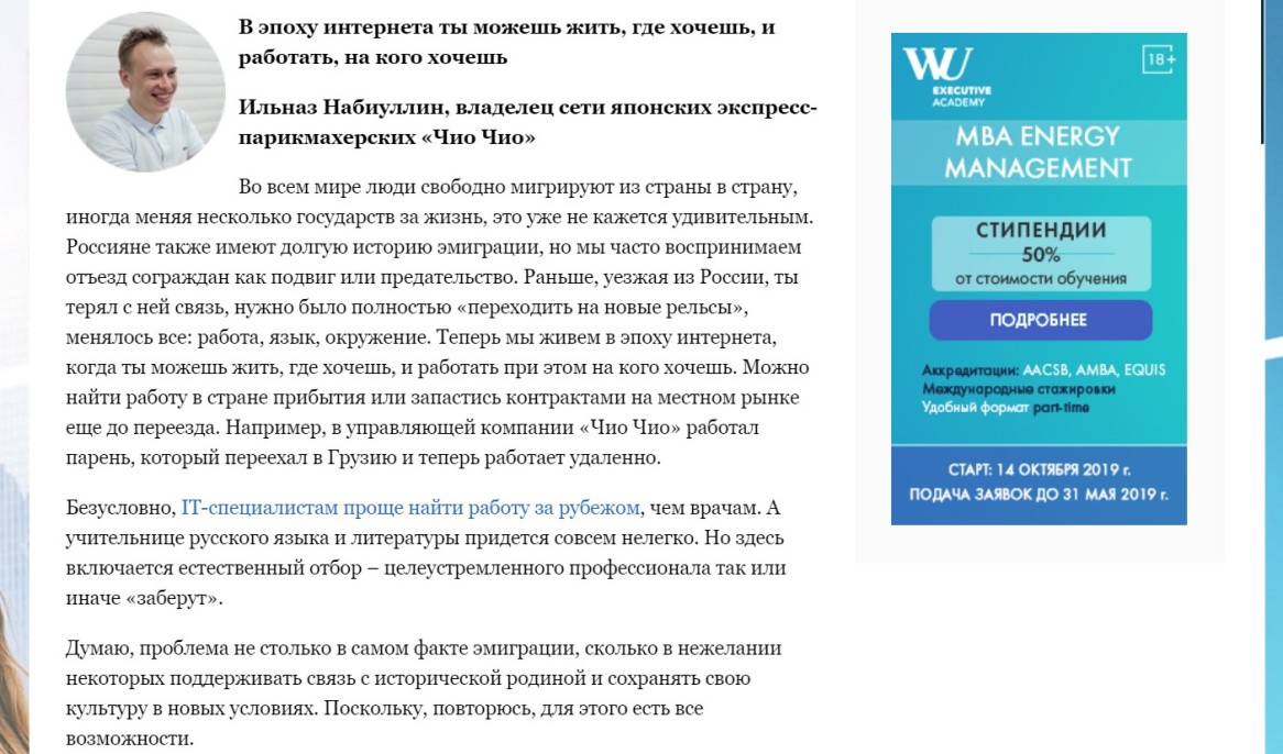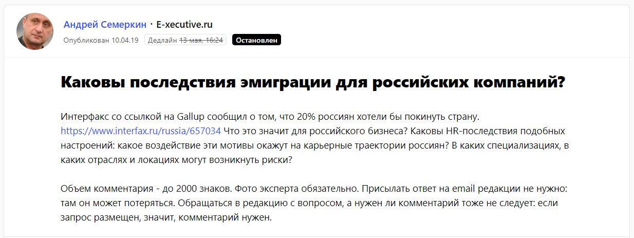 Или же в другой раз организовали не статью, а большой комментарий от имени Ильназа на площадке E-xecutive. Редакция спрашивала, чем грозит эмиграция граждан для российского бизнеса.