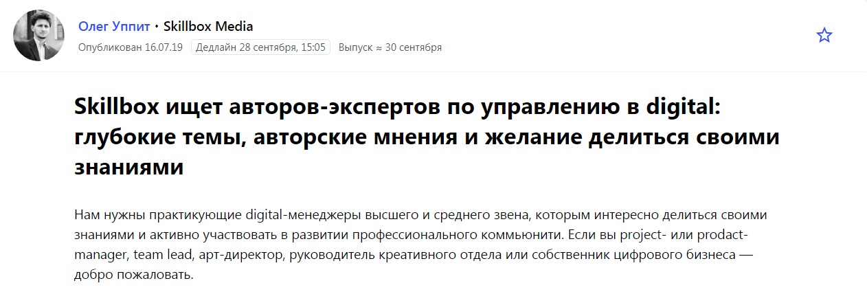 Сейчас я занимаю должность редактора портала онлайн-университета Skillbox, занимающегося обучением digital-профессиям. Удивительно, но Pressfeed особенно помогает нам в поиске фактуры и экспертов. В основном наши тексты — это экспертные колонки. При этом найти хороших колумнистов по маркетингу или программированию самостоятельно практически нереально. А вот запросы на Pressfeed мониторят помощники и пиарщики, которые сразу понимают, готов ли их автор говорить или писать на заданную тему.