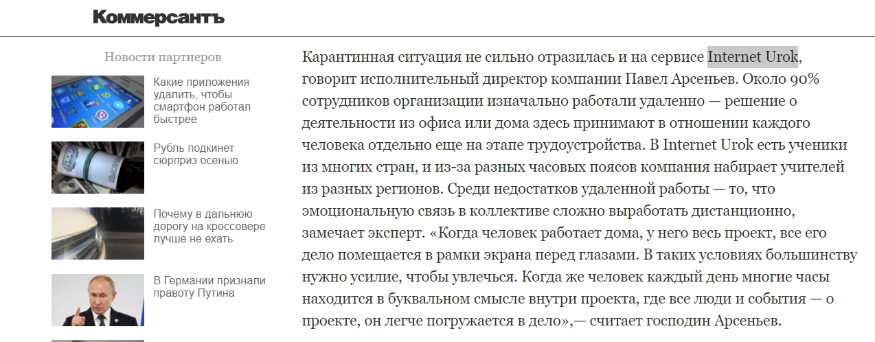 У деловых изданий большая аудитория — и среди читателей есть наши потенциальные клиенты, а именно продвинутые, активные и мыслящие широко родители, которые готовы отдать детей в дистанционную школу. Кроме того, публикации в крупных изданиях вызывают доверие со стороны будущих пользователей ИнтернетУрока: если о нас пишет условный «Коммерсантъ», значит, мы не какой-то стартап-однодневка, а действительно серьезный и устоявшийся на рынке сервис.