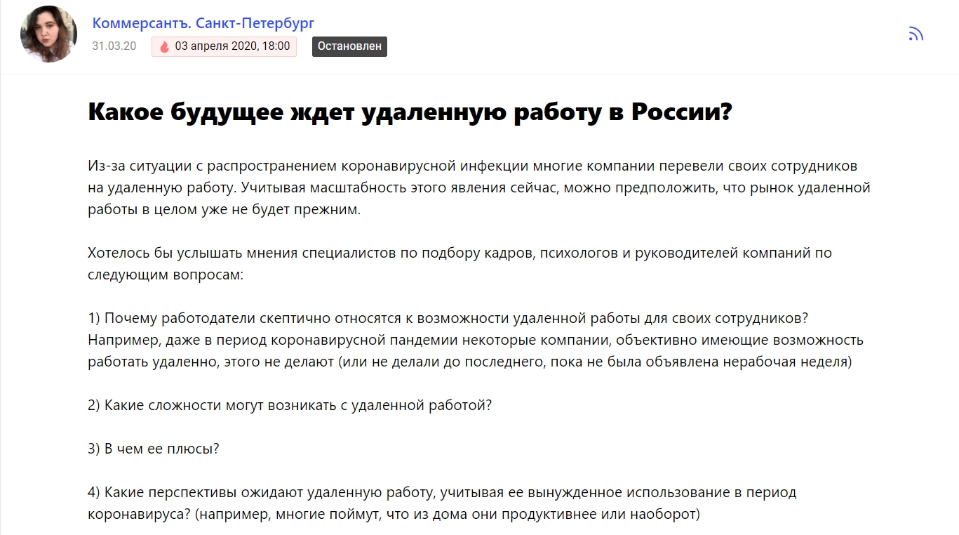 3. Пытаться и пробовать снова. В случае с «Коммерсантом» запрос был закрыт раньше времени, но я все равно попыталась отправить ответ, и все получилось. Даже если с каким-то изданием не сложится сразу, то нужно продолжать мониторить запросы от него и готовить ответы, когда есть возможность.