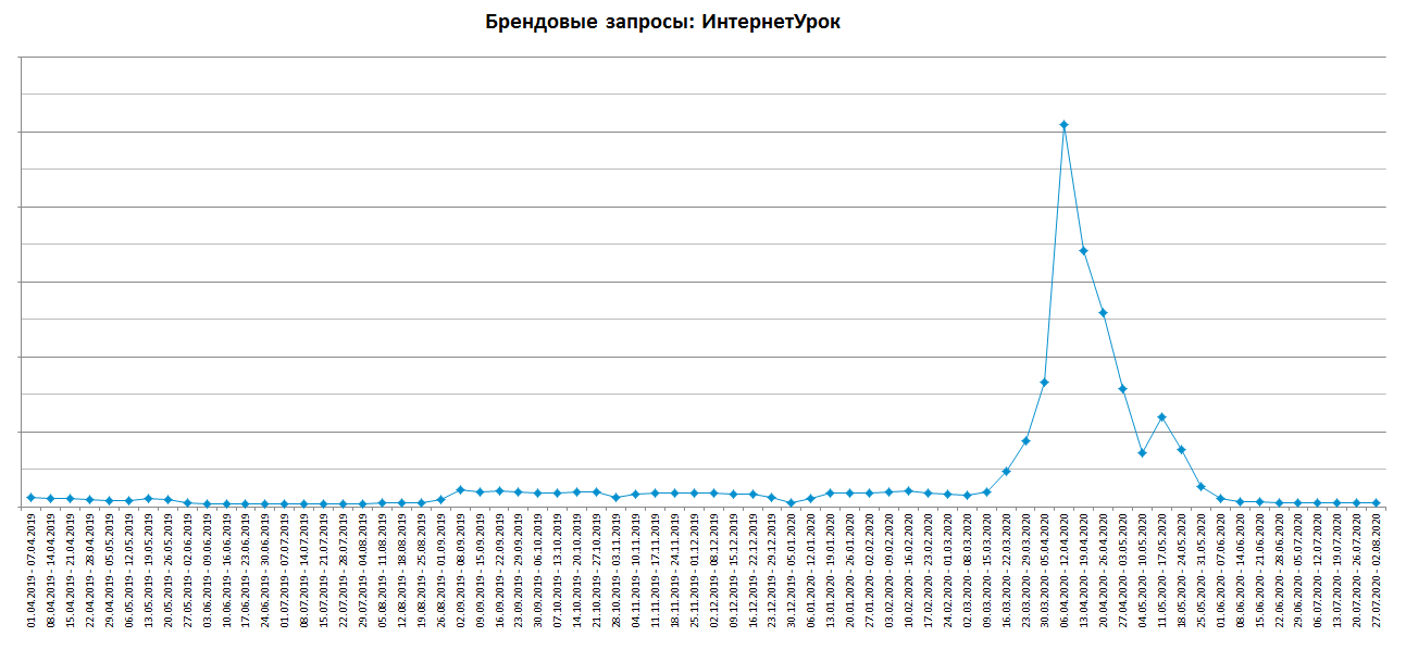 Гипотеза, что после выхода заметных публикаций можно наблюдать всплеск брендовых запросов, основывается на том, что после удачных размещений у блогеров мы видим такие вспышки. Кроме того, гигантский скачок, естественно, был в марте-апреле, и мы связываем его не только закрытием школ на карантин и естественным интересом к качественному дистанционному обучению. Благодаря наработанной репутации ИнтернетУрока и моим усилиям мы попали в списки и подборки рекомендованных ресурсов от «Минкомсвязи», «Минпросвещения», «МЭШ», Mail.ru и «Я.Коллекции». И как раз тогда мы наблюдали всплеск брендовых запросов, что подтверждает нашу теорию.