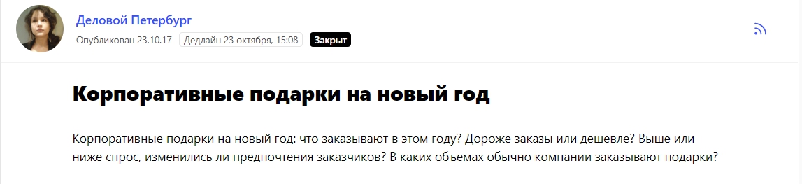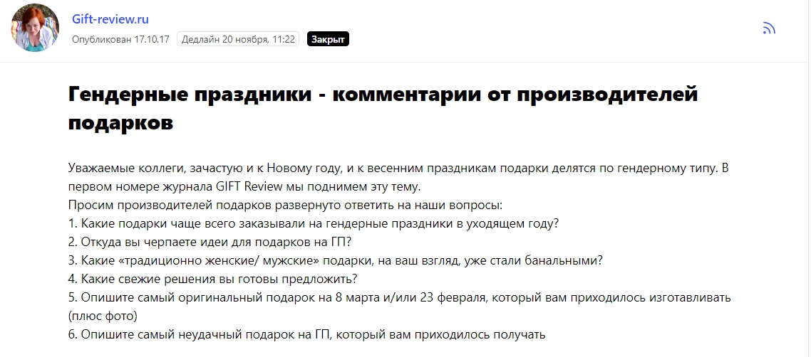 Очень ценно, что на Pressfeed запросы выкладывают не только общеизвестные медиа (типа «РБК» и «Коммерсанта»), но и нишевые площадки. На сервисе мы познакомились с изданием Gift-review.ru. Это узкопрофильный журнал, которые пишет только о подарках. Его читают исключительно те люди, которые занимаются подарками, — это ивент-менеджеры, пиарщики, работники рекламных агентств, менеджеры по персоналу, секретари.
