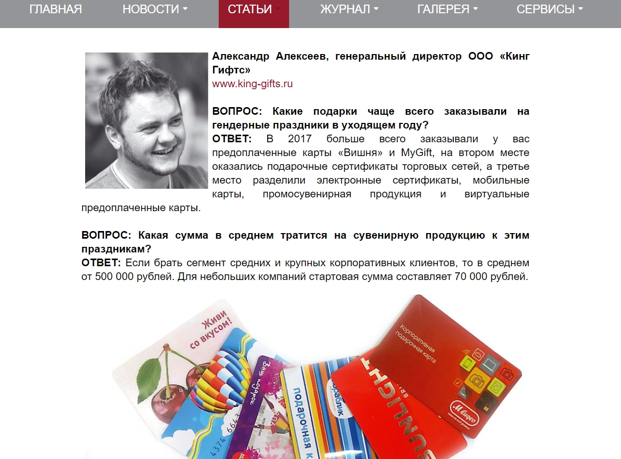 В материалах мы можем говорить о плюсах таких подарков, о возможных вариантах сертификатов и карт и так далее. Люди, ответственные за выбор подарков, узнают о разных картах и хотят их купить. Тем самым, растут продажи. Публикации в СМИ могут приводить клиентов напрямую, в дальнейшем мы не раз убеждались в этом на своем опыте.