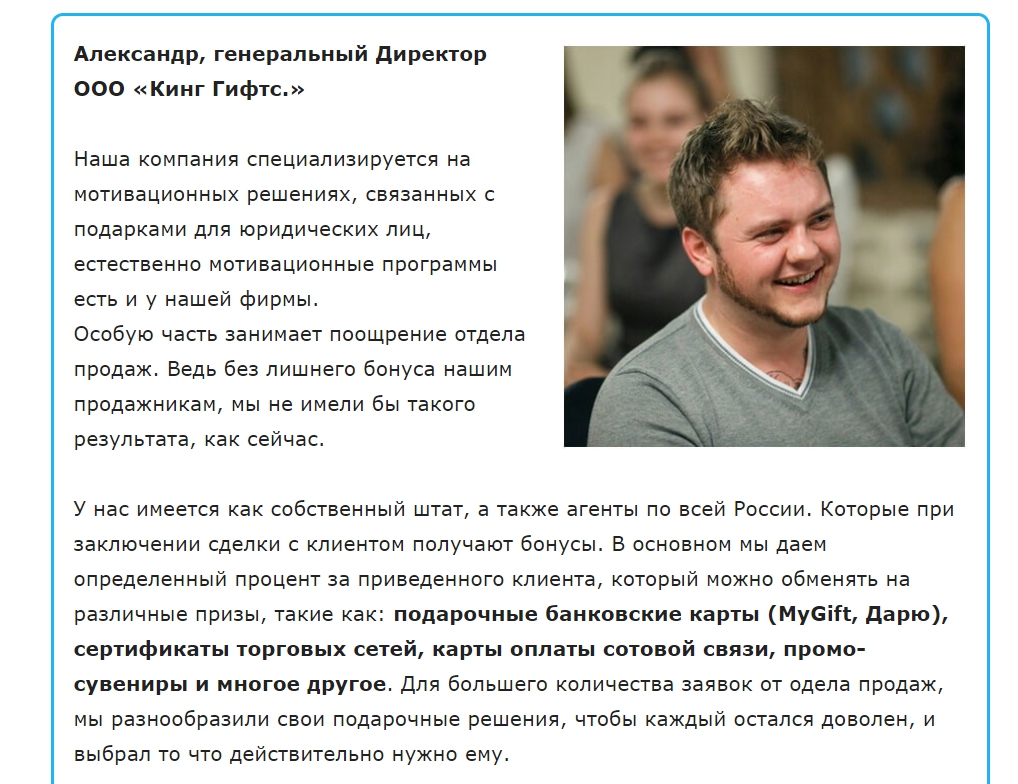 Меня зовут Александр Алексеев, я директор компании «Король Подарков» (King Gifts). Мы занимаемся продажей подарочных сертификатов и предоплаченных карт для юридических лиц. Организации заказывают у нас карты в больших объемах, чтобы потом дарить своим партнерам, сотрудникам, клиентам. Большая часть заказчиков — крупные компании (TELE2, 1C, «Согаз» и др.), госучреждения (больницы, кооперативы, «РЖД» и др.), банки («Сбербанк», «Юникредит», «Совкомбанк») и маркетинговые агентства.