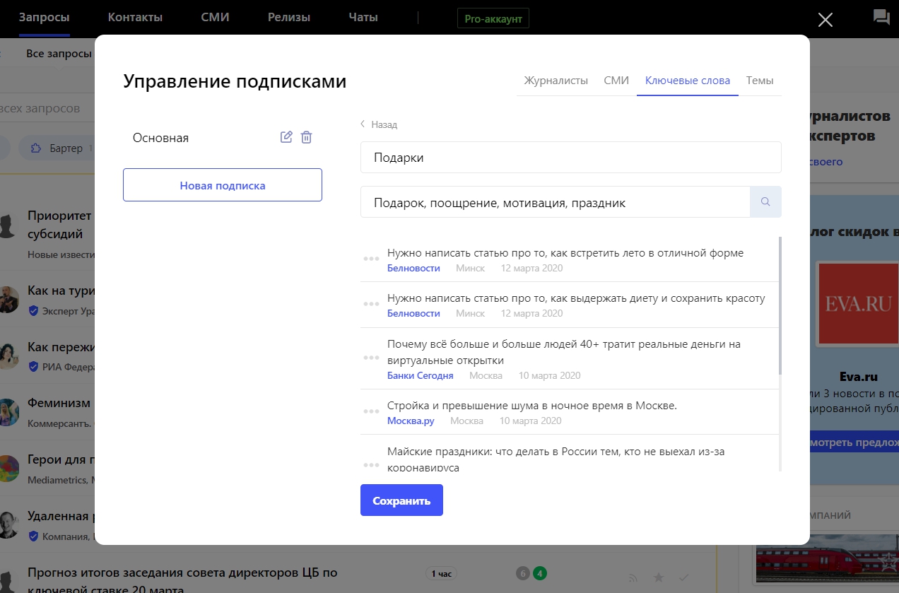В приоритете издания, которые пишут о бизнесе, управлении персоналом, клиентском сервисе. Чтобы не пропустить актуальный для нас запрос, лучше сформировать подписку по ключевым словам (примеры наших слов — «подарок», «мотивация», «поощрение» и тому подобное), тогда подходящие запросы будут сразу приходить на почту. Это еще сильнее упрощает работу со СМИ.