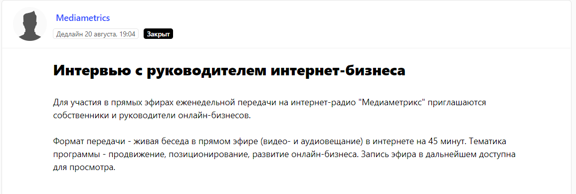 Сразу после ссылок на социальные сети идет запись моего интервью на радио MediaMetrics. Мы познакомились с радио MediaMetrics через сервис журналистских запросов Pressfeed. Это платформа, где редакции совершенно разных медиа ― от профильных блогов до федеральных телеканалов ― ищут героев, экспертов для своих материалов. То есть продюсер канала, редактор на радио или журналист публикует там запрос: нужен вот такой-то человек для написания статьи или записи эфира. Выставляет дедлайн ― до такого времени он ждет отклики. Необходимо оперативно ответить и кратко рассказать о том, кто вы, кого представляете, на какие темы рассуждает эксперт. Если все окей, то журналист принимает ответ и дальше уже идет работа над текстом, либо эксперта приглашают на съемки.