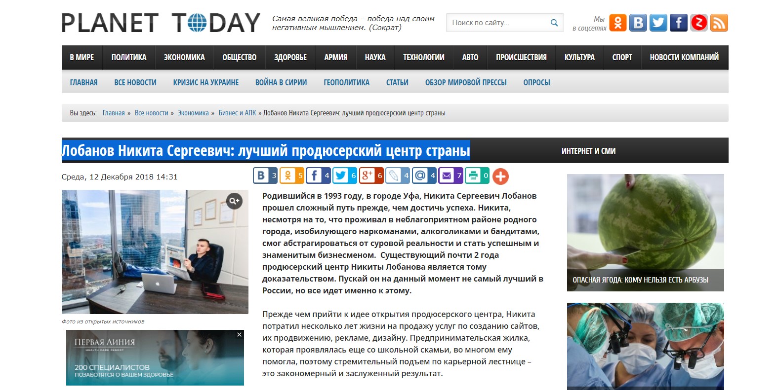 На сайте Planet Today в декабре 2018 года вышла статья, где я кратко рассказал о жизни продюсерского центра, о моем пути к успеху, о планах на будущее.