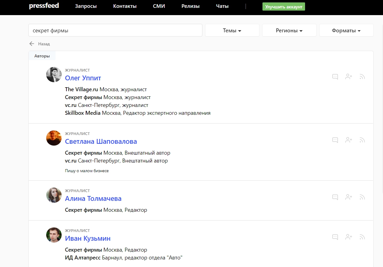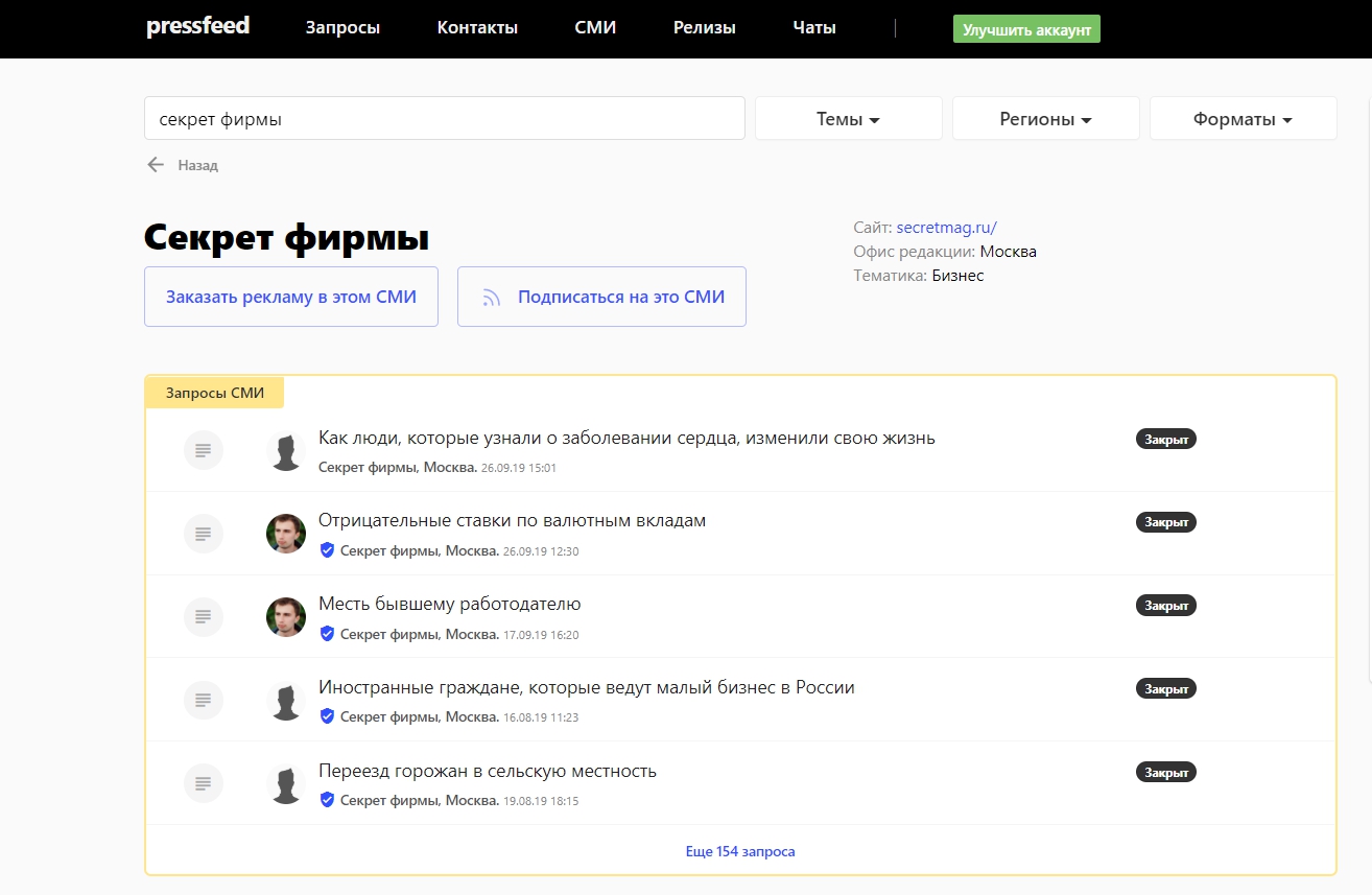 Можно выходить на новые площадки через Pressfeed. Например, вы задумали познакомиться с журналистом из издания «Секрет фирмы». Заходите в раздел «СМИ» и ищите «Секрет фирмы» по поиску. Сначала вы увидите последние запросы от издания.