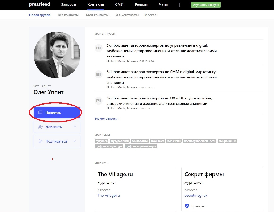 Выбирайте журналиста, с которым хотите связаться, и напишите ему свои предложения во внутреннем чате.