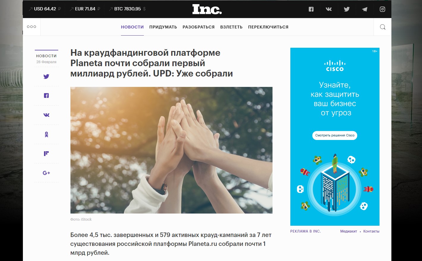 Например, Inc. опубликовали новость о том, что за годы существования planeta.ru авторы собрали 1 миллиард рублей. Впечатляющая цифра привлекла редакцию.