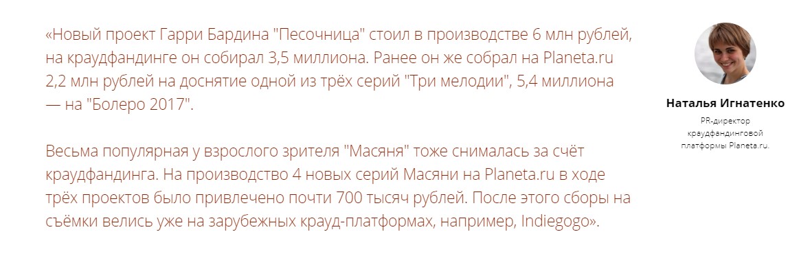 Между тем, в это издание можно зайти и через Pressfeed. Как-то редакция делала спецпроект об индустрии мультфильмов в России. Разместила запрос на сервисе. С первого взгляда тема не наша, но я быстро сообразила и собрала статистику ㅡ на создание каких мультфильмов собирались средства через краудфандинг, в том числе через нашу платформу.