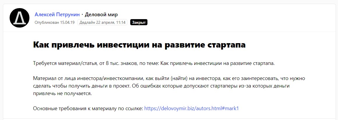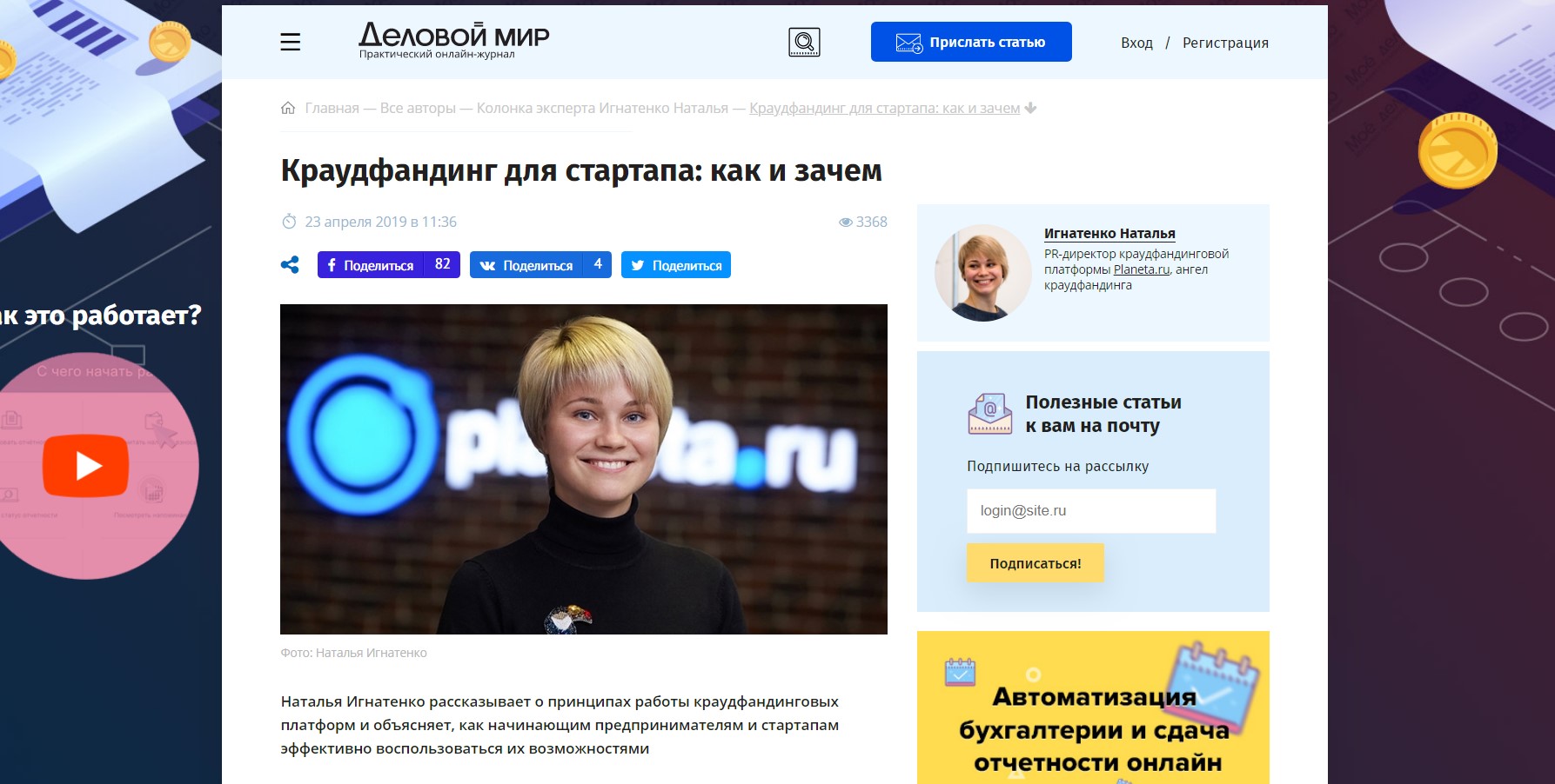 Также я рассказывала бизнес-изданию «Деловой мир», что такое краудфандинг и зачем он нужен. Изначально редакция хотела получить статью на тему, где найти деньги на развитие стартапа.