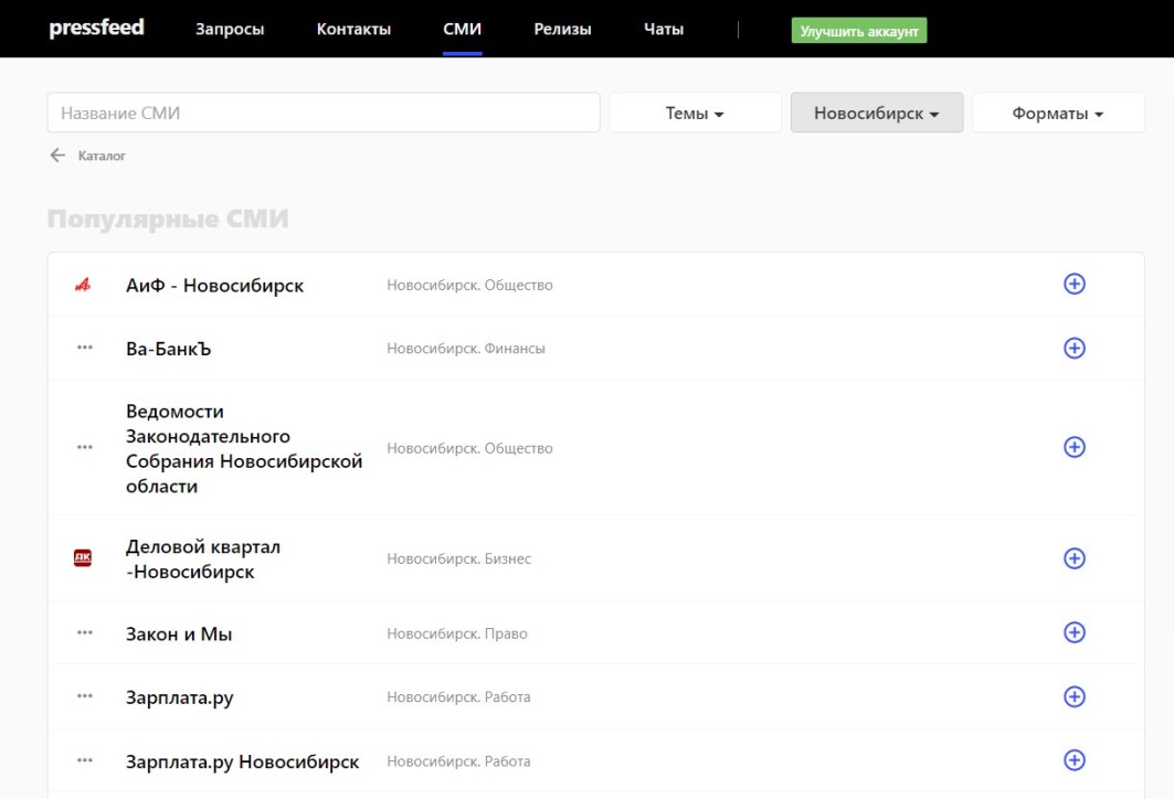 Еще одна полезная функция на Pressfeed ㅡ каталог СМИ по тематикам и регионам. Пользуюсь им, когда составляю базу СМИ для конкретного инфоповода, особенно помогает, когда мы готовимся к «Школе краудфандинга» в конкретном регионе.