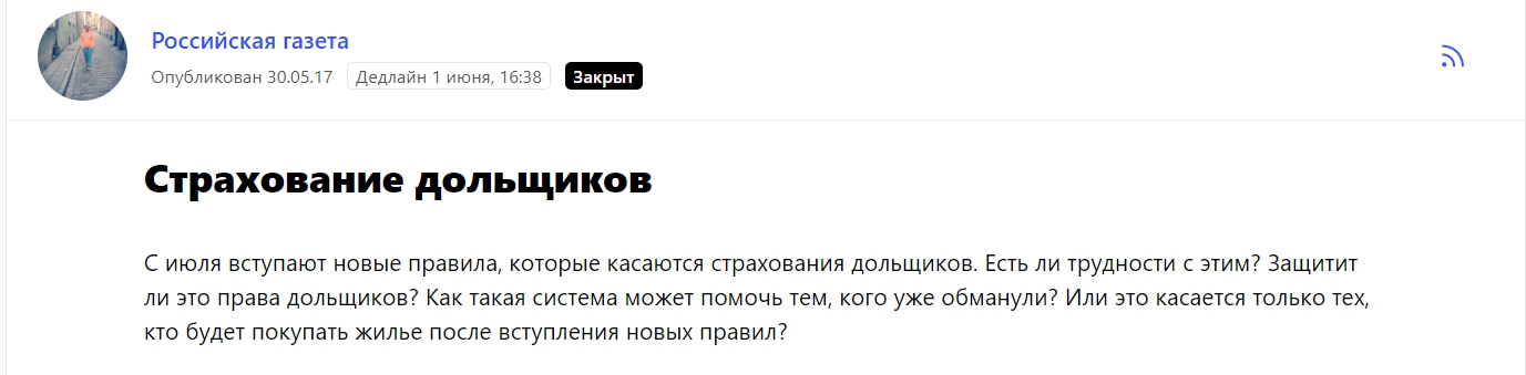 Например, вот запрос от «Российской газеты» — журналист собирал информацию и мнения экспертов о страховании дольщиков.