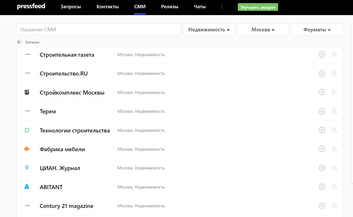 Можно зайти в базу СМИ, установить фильтры (например, отрасль и город — для нас это были «Недвижимость» и «Москва») и выбрать несколько площадок. Затем написать в редакцию прямо на Pressfeed через внутренние чаты (эта функция доступна только пользователям Pro-аккаунта).