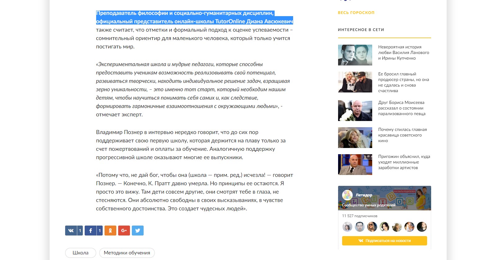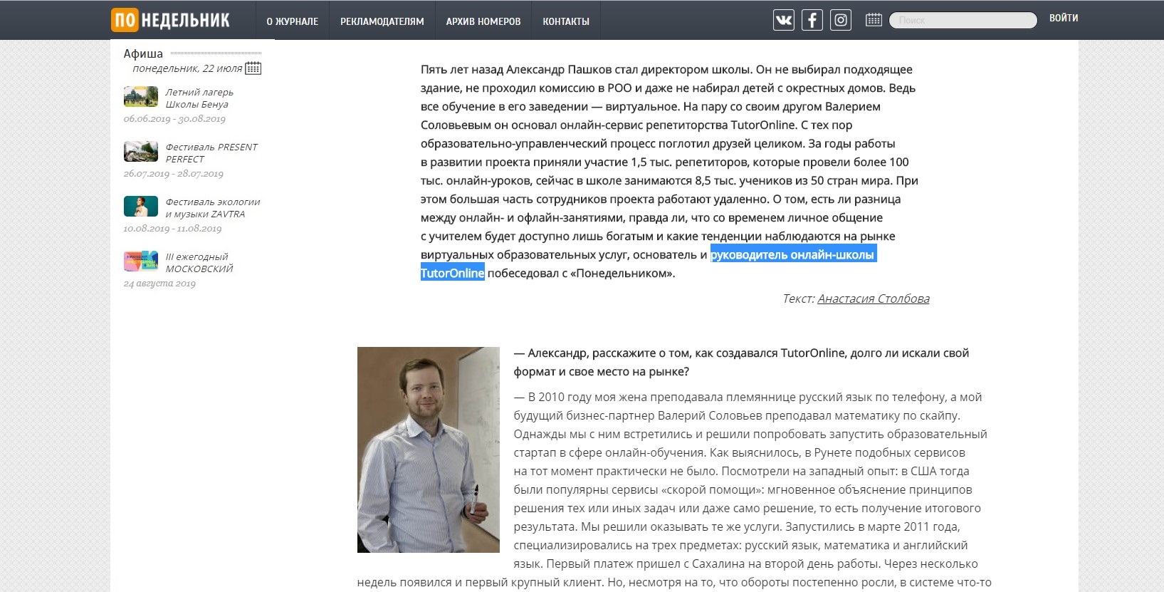 Иногда мы делали материалы не только непосредственно об образовании, но об онлайн-школе как бизнесе: руководитель TutorOnline Александр Пашков нередко давал интервью для деловых ресурсов. Например, благодаря Pressfeed мы организовали разговор с сайтом «ПОнедельник».